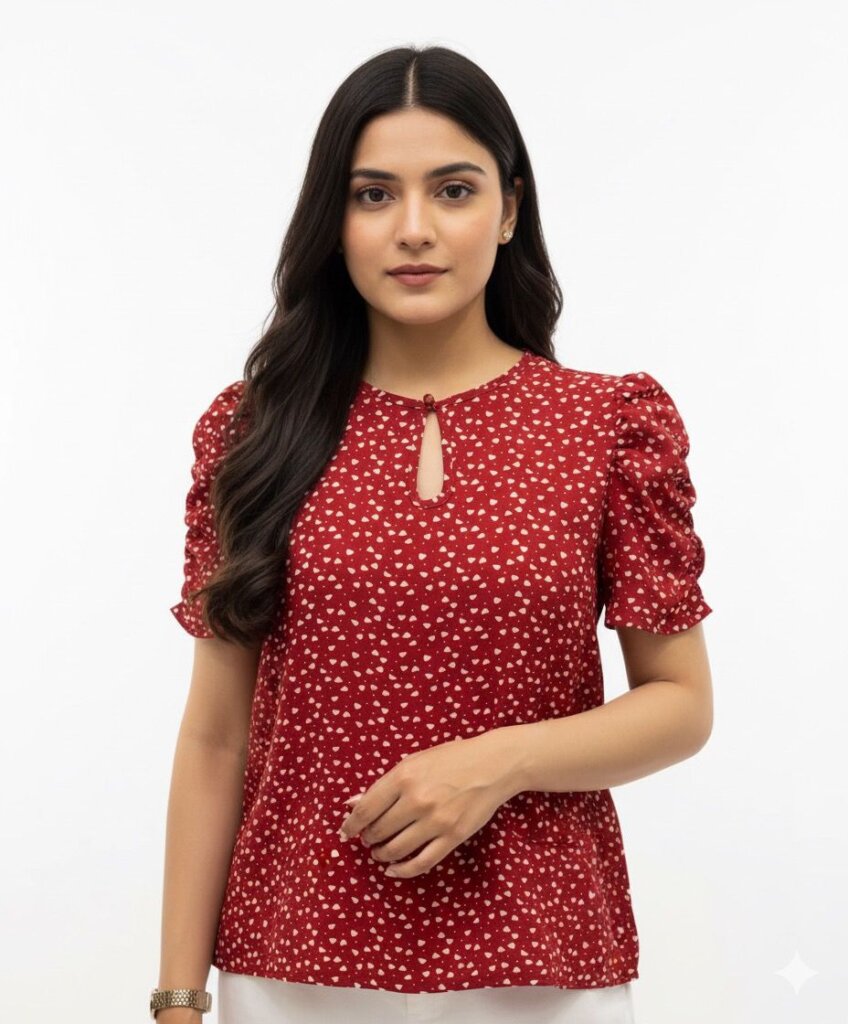 The rich ruby shade enhances all skin tones, making it perfect for dinners, parties, and festive gatherings. Style it with black trousers, a pleated skirt, or even denim—its versatility ensures you stay stylish no matter how you wear it.